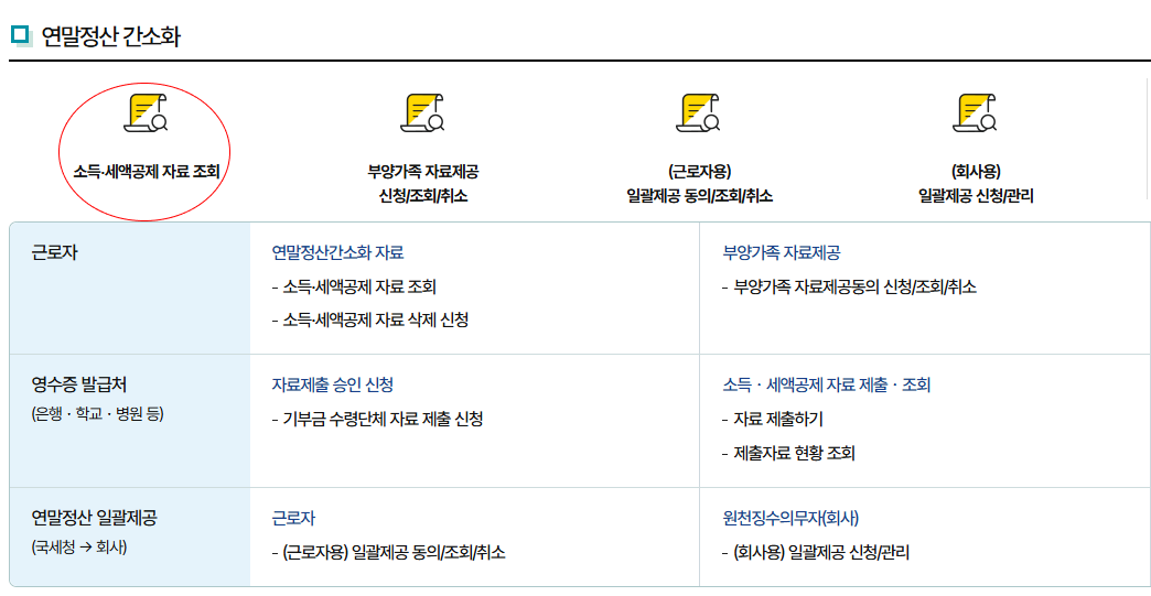 근로자가 각종 공제 항목에 필요한 서류를 자동으로 조회할 수 있는 서비스입니다.