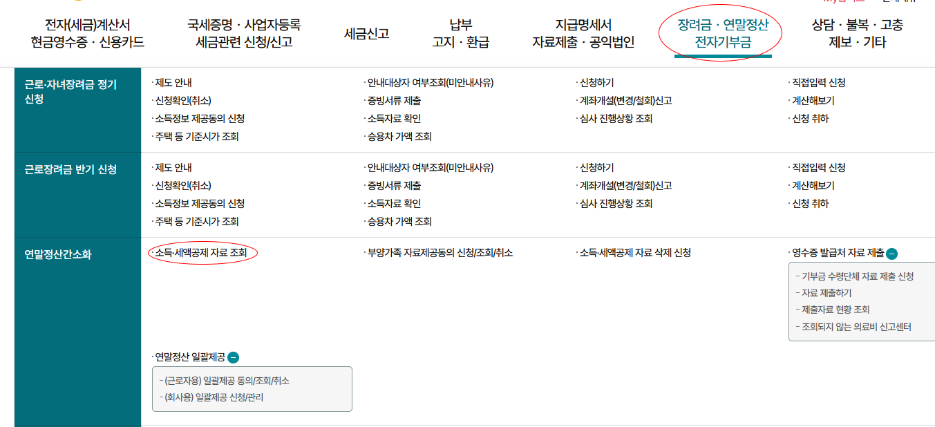 - 메뉴에서 "장려금·연말정산 전자기부금"을 클릭한 후, "소득·세액공제 증빙 자료 확인" 항목을 선택하면 예상 환급액과