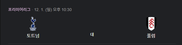 | 2024년 12월 1일 (일) | 22:30 | 토트넘 vs 풀럼 | 토트넘 홋스퍼 스타디움 |